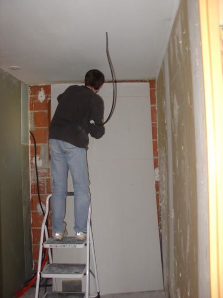 On s’est donc attaqué samedi à la découpe de la plaque de placo-laine (7 cm de laine de verre surlequel est collé une plaque de BA13 => 13 mm de plaque de platre). On pensait que les gaines électriques serait compressées dans la laine de verre et qu’il n’y aurait pas besoin de découpe. Que nenni! Il a fallu faire une découpe pour les gaines. Evidemment, il a fallu faire :
