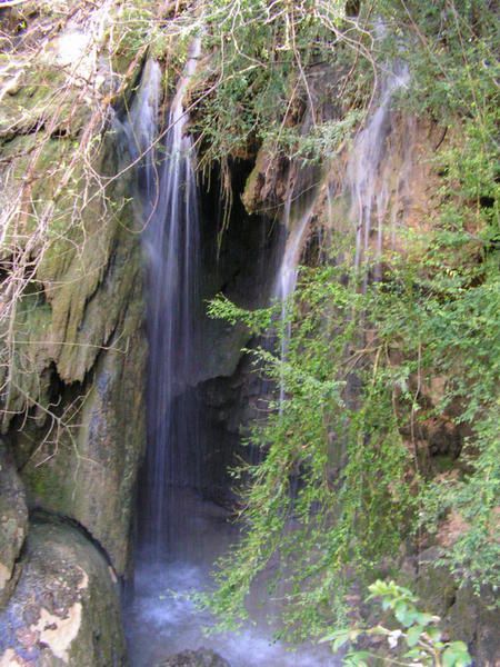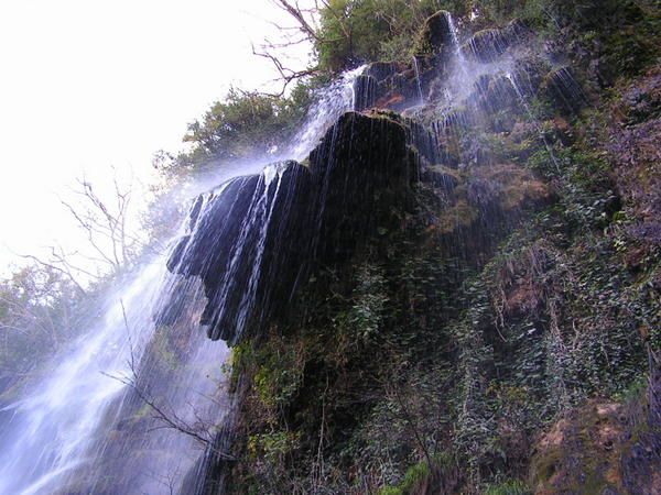 Au dessus, on passe dans un petit aven où il semble y avoir eu il y a longtemps un bassin maintenant détruit. Travertins et anciennes draperies sont encore visibles. Après avoir traversé l’ancien lit à sec du ruisseau, on arrive en haut de la cascade où on découvre le ruisseau déboulant de la montagne dans une série de petits escaliers et de bassins.