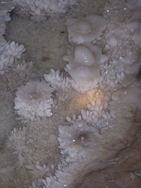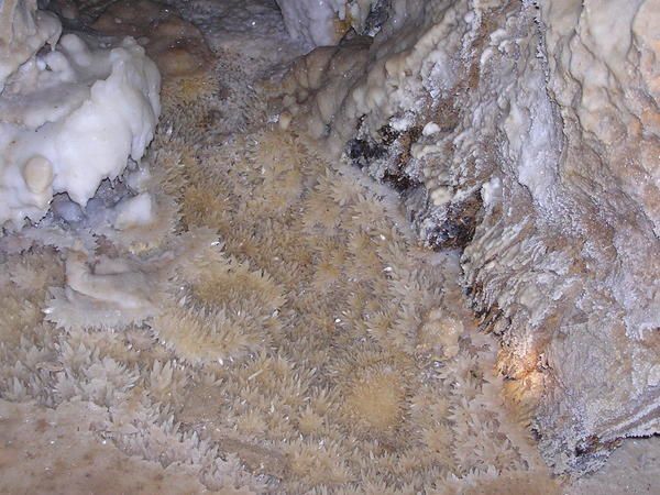 De plus la découverte de ces merveilles se fait dans le climat magique de la spéléo, loin des lieux fréquentés habituels. Hors du temps. Au centre de la terre. Prisonniers des cristaux d’aragonite , entre les cierges de calcite triangulaire. Et les fleurs de Calcite …. plus ou moins colorées par la présence d’argile.