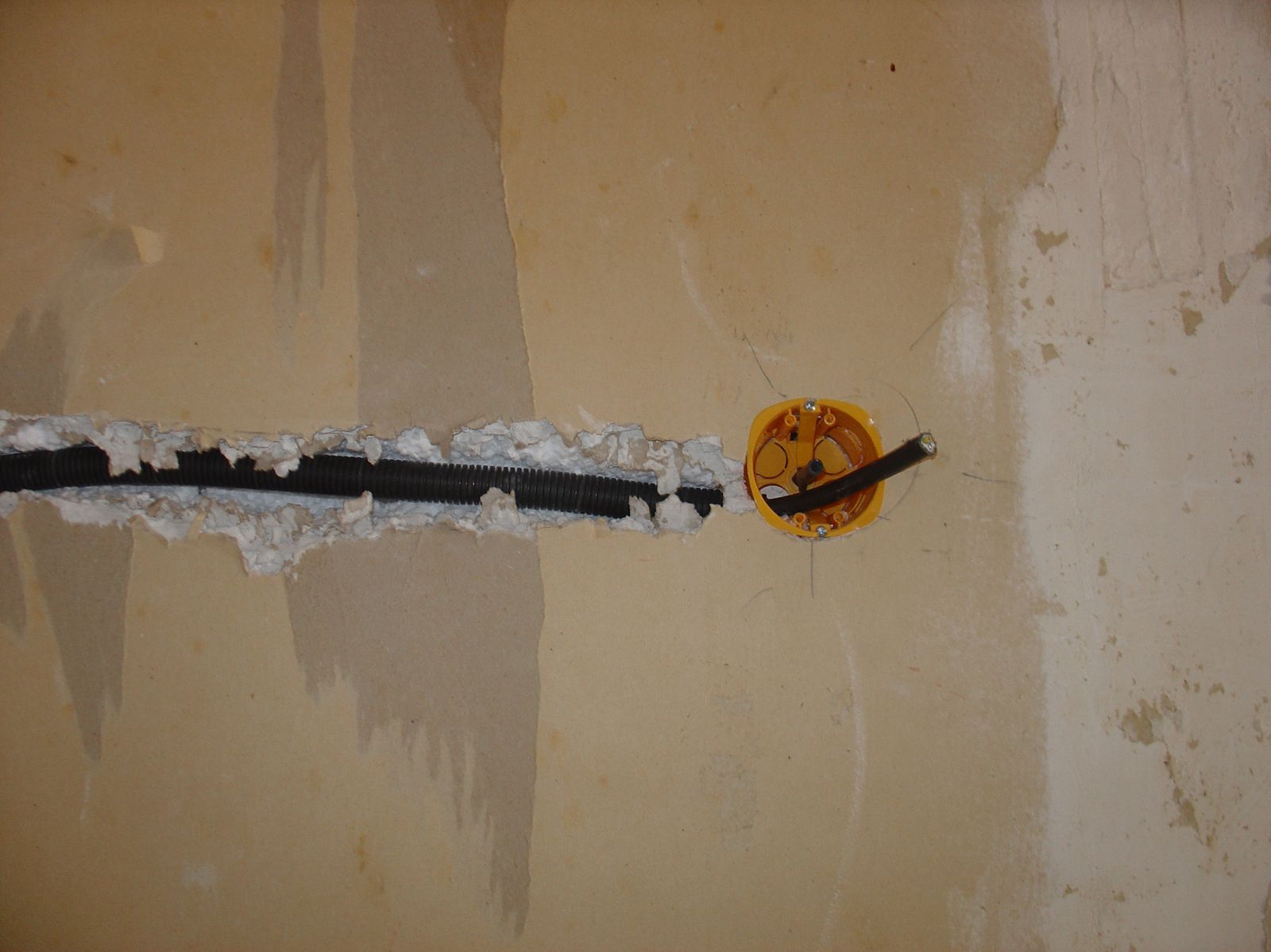 – l’électricité. On modifie l’emplacement des appliques existantes (qui étaient faites pour être au dessus d’un lit) pour une position plus haute correspondant plus à notre usage. Pour déplacer les appliques, nous avons fait des saignées. N’ayant pas de rainureuse, ni de meuleuse, nous avons utilisé un marteau… Pour les vrais professionnels, il existe même des outils qui ne laissent aucune saignée à reboucher: avec un système de boule chauffante qui permet de perforer le polystyrène. C’est un peu moins propre dans notre cas, mais cela marche bien :