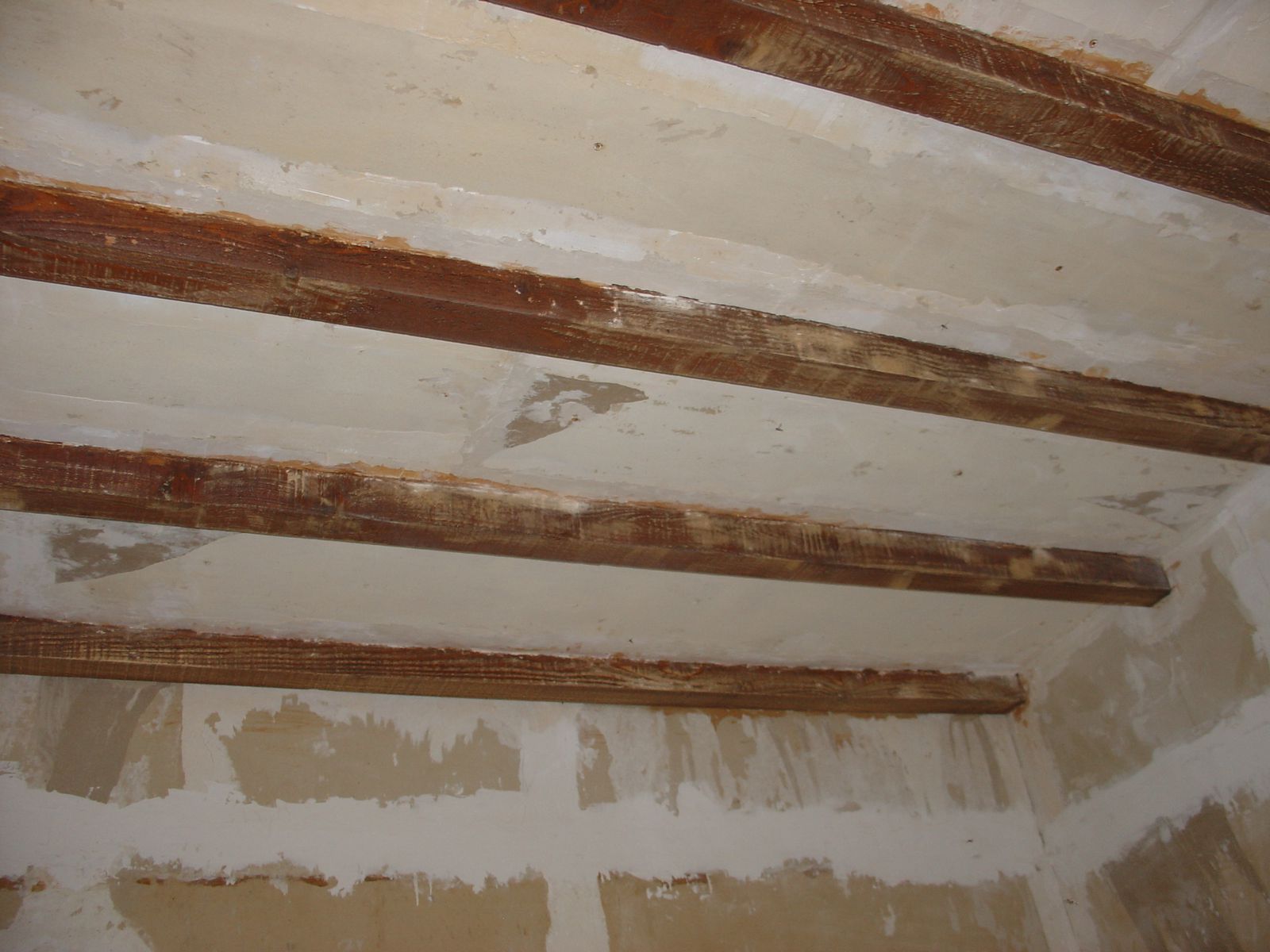 – Le deuxième chantier est un peu moins agréable: le ponçage… Il y a de l’enduit sur les poutres et le mur et le plafond sont dans un sale état.
