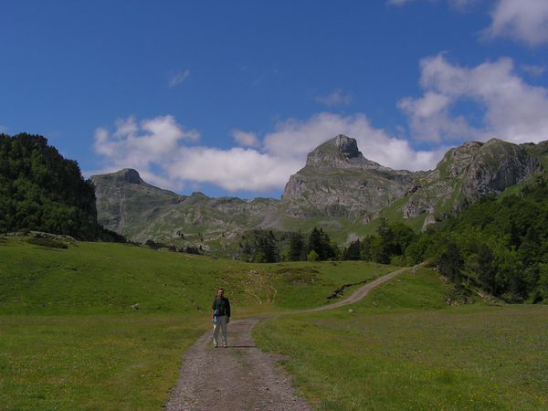 On passe le pont de Bious puis on arrive sur un large plateau sur lequel serpent le gave ( ne pas prendre la direction des lacs d’Ayous, ça ce sera pour une prochaine rando, une autre fois). Attention on a failli manquer le petit chemin qui part sur la gauche pour monter en lacets dans la prairie.