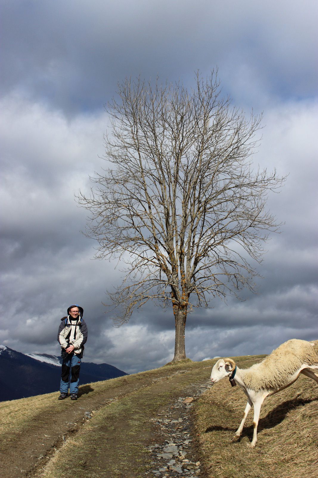 On traverse de grands pâturages. Première rencontre d’Esteban avec des moutons.