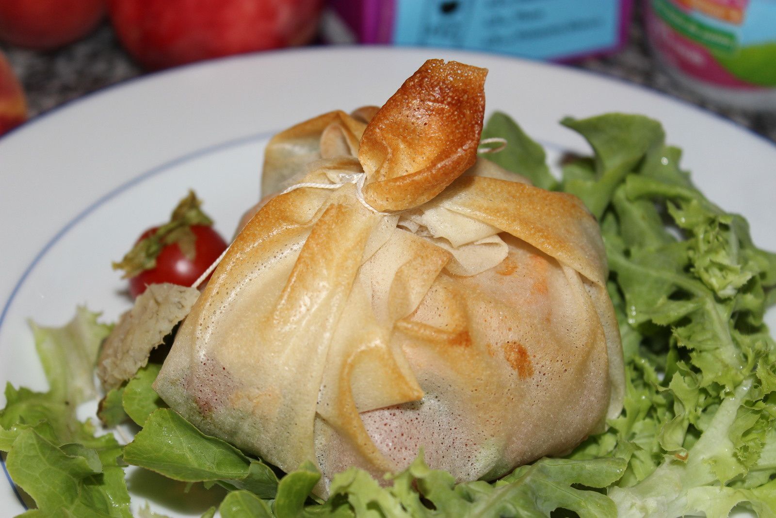 - Replier les feuilles de brick de façon à faire un petit sac. Moi j’ai utilisé de la ficelle alimentaire.